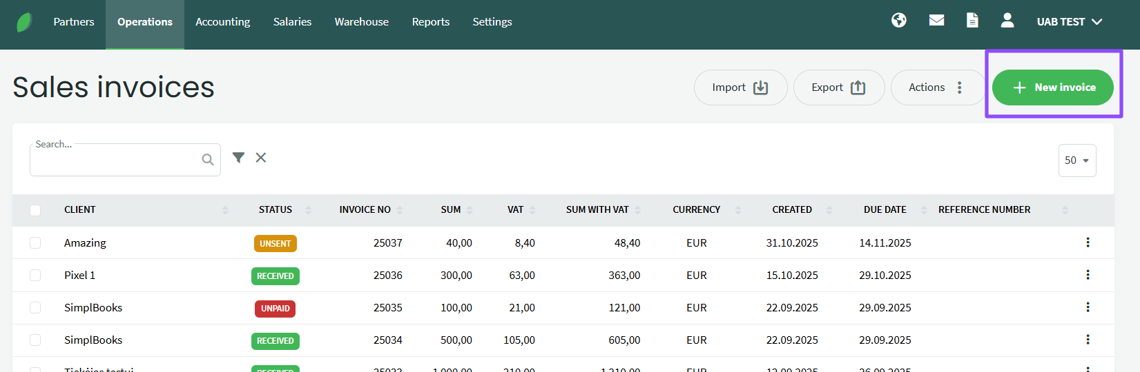 ● To enter a new sales invoice, go to Operations -> Sales invoices -> New invoice