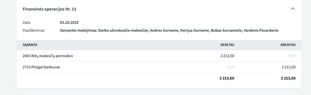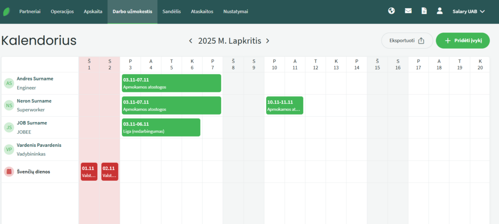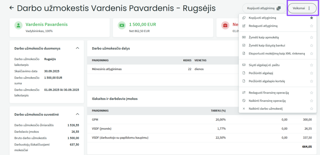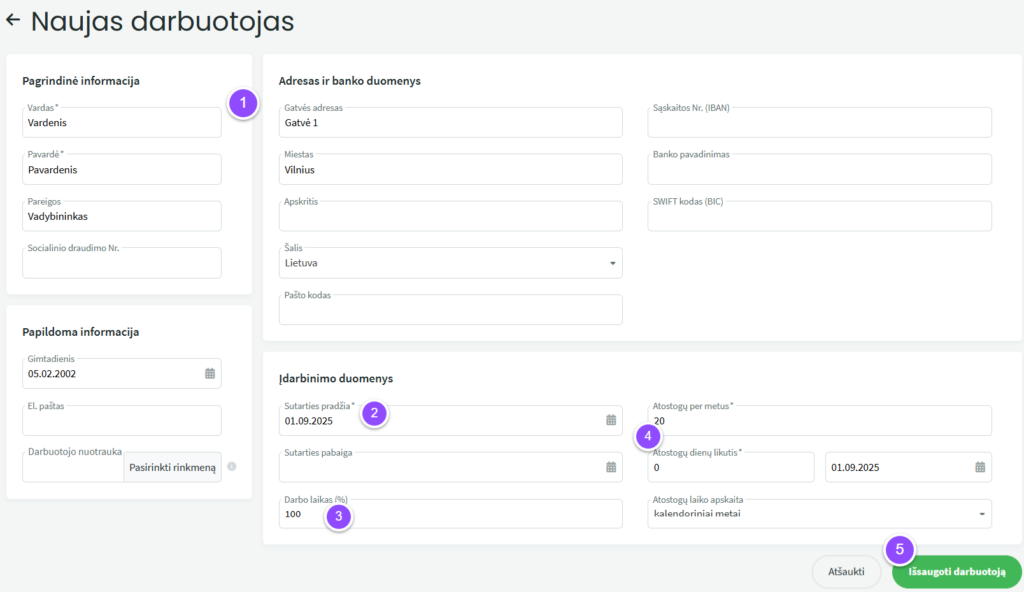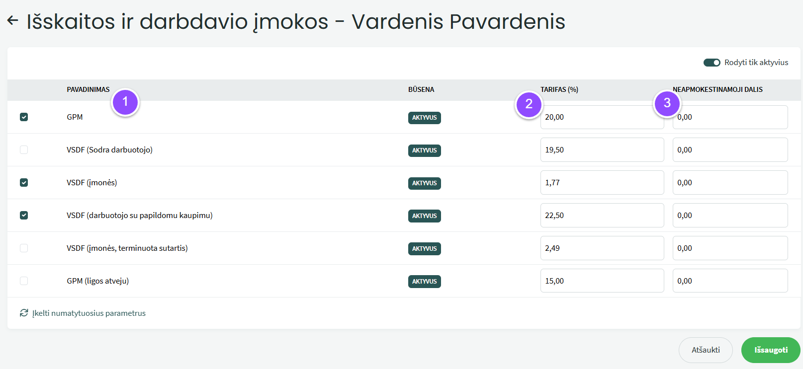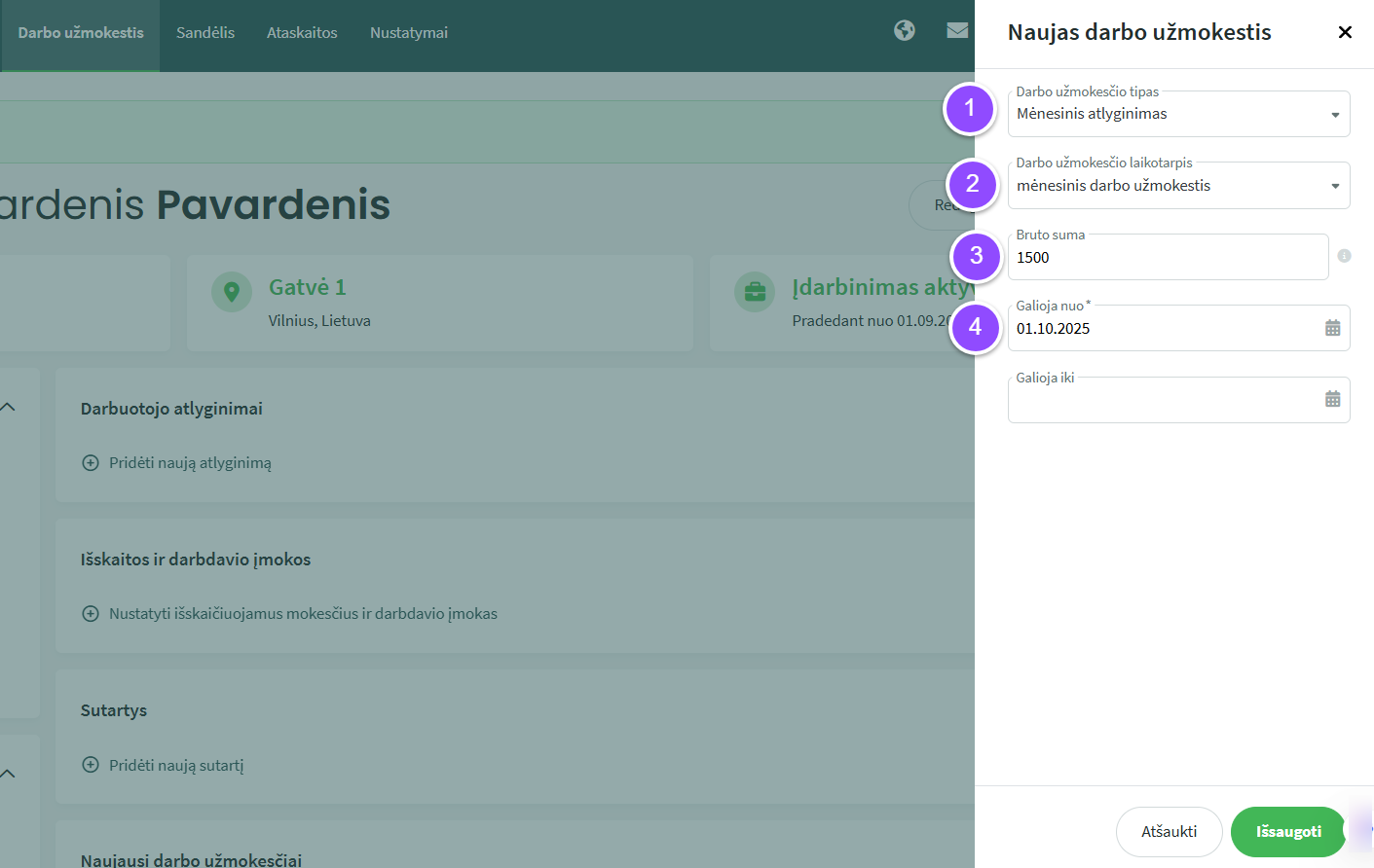 For example, if the employee works under an open-ended contract and contributes additionally to a pension, (1) check GPM, VSDF employee with additional contributions, and VSDF company. If you want to specify a rate different from the suggested one (2), you can adjust it here. If the employee applies NPD (non-taxable income amount), in field (3) you can enter the non-taxable amount. The size depends on the employee’s salary: if the employee earns minimum wage, enter the maximum NPD amount; if the salary is higher, enter a proportionally smaller amount. You can check the NPD calculator on the VMI website. The NPD amount can be entered/adjusted with each payroll calculation. Save the data.