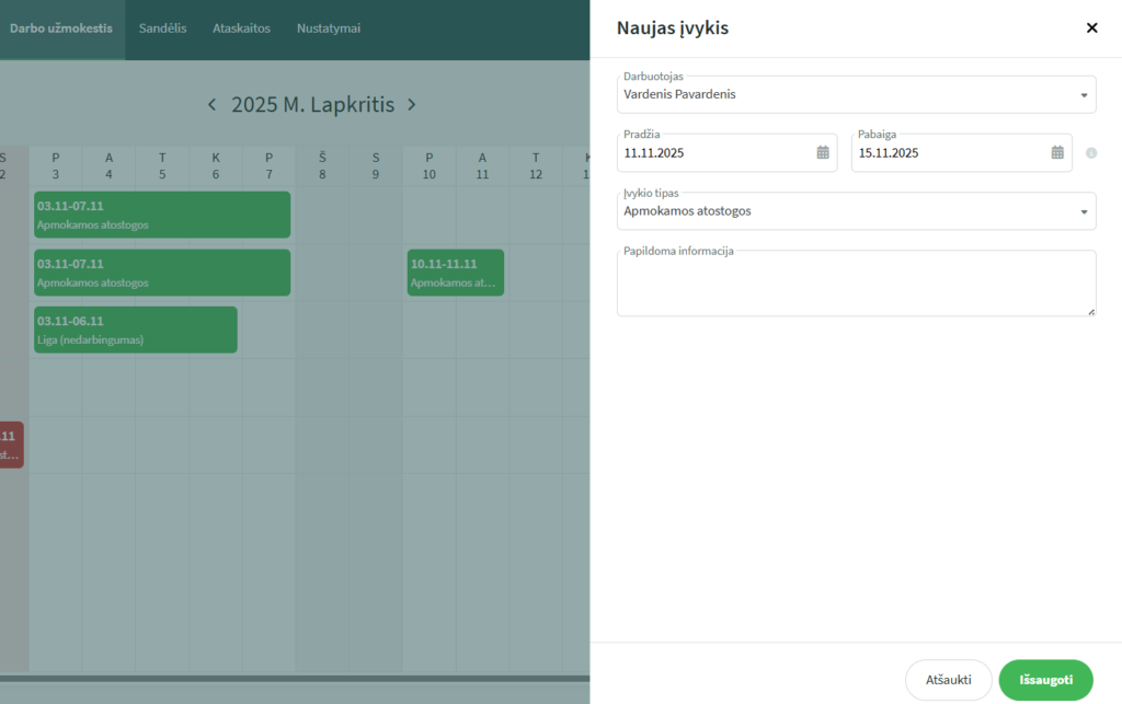 If you want to enter a type of working time, click +Add event or click directly on the chosen employee’s day. In the window that opens, specify the dates and select the event type. Public holidays are filled in automatically in the calendar, but if you want to add one manually, click on the desired day and select “Holiday”, then enter the information.