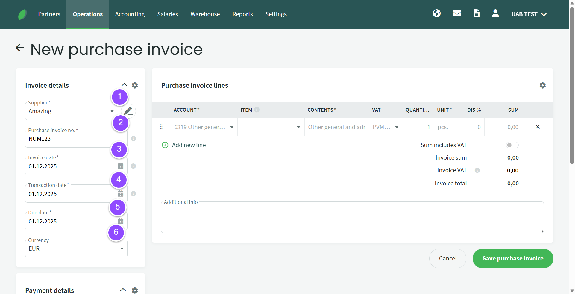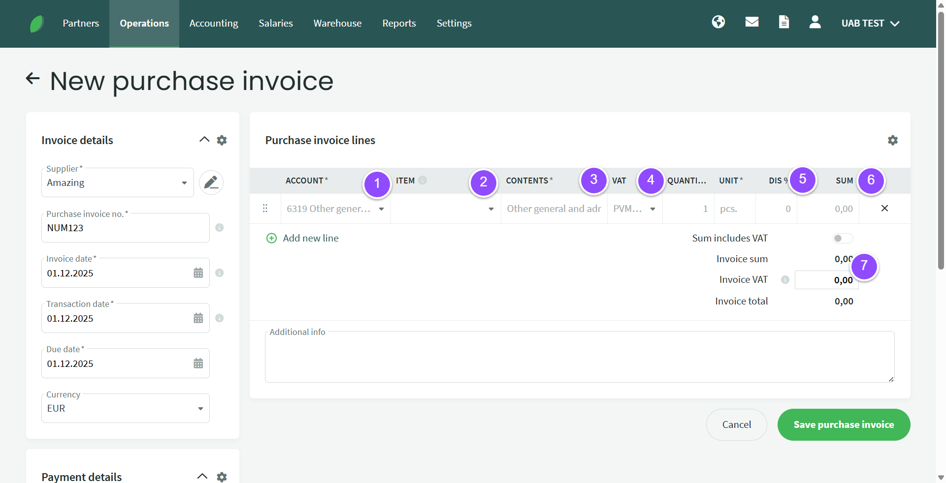 4. VAT – I-SAF class selection. The default setting is VAT1 – 21%. When purchasing reverse charge services and goods, you must also use the appropriate expense account (see VAT report) and select the appropriate VAT class (read more about them here). In order to deduct part of the VAT, the purchase invoice shows the full VAT amount, However, when saving the purchase invoice, it is recorded so that, for example, 50% of the amount goes to the main expense account and the other 50% is included in, for example, the non-deductible expense account line. If the company is not a VAT payer, the VAT class selection field is inactive.
