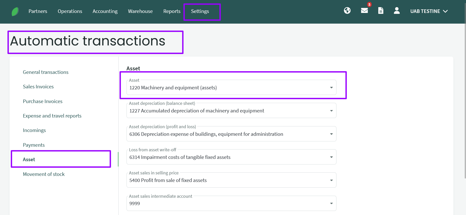 - Fixed asset depreciation (balance sheet) – to which account in the balance sheet is the depreciation being carried, i.e. the depreciation of the fixed asset and its loss in value. The same account as the one in the automatic entry settings for fixed assets is assigned by default.