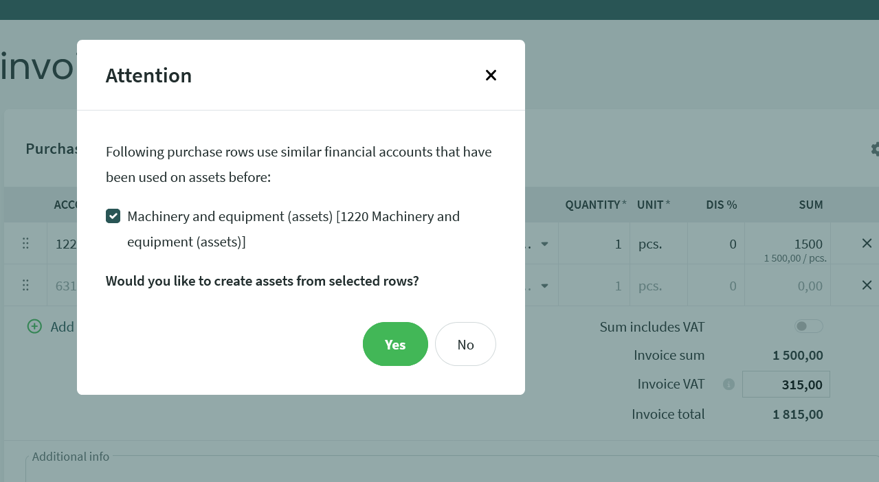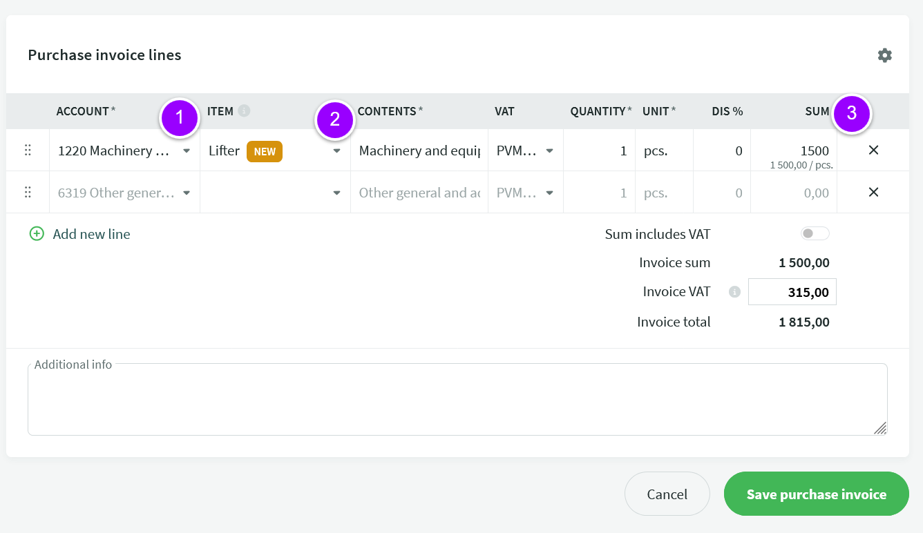 Enter the purchase invoice data as usual. The difference between recording fixed assets is that on the block of purchase invoice rows a fixed asset account should be used in the “account” field which, by default, has the number “12xx” in the account plan.