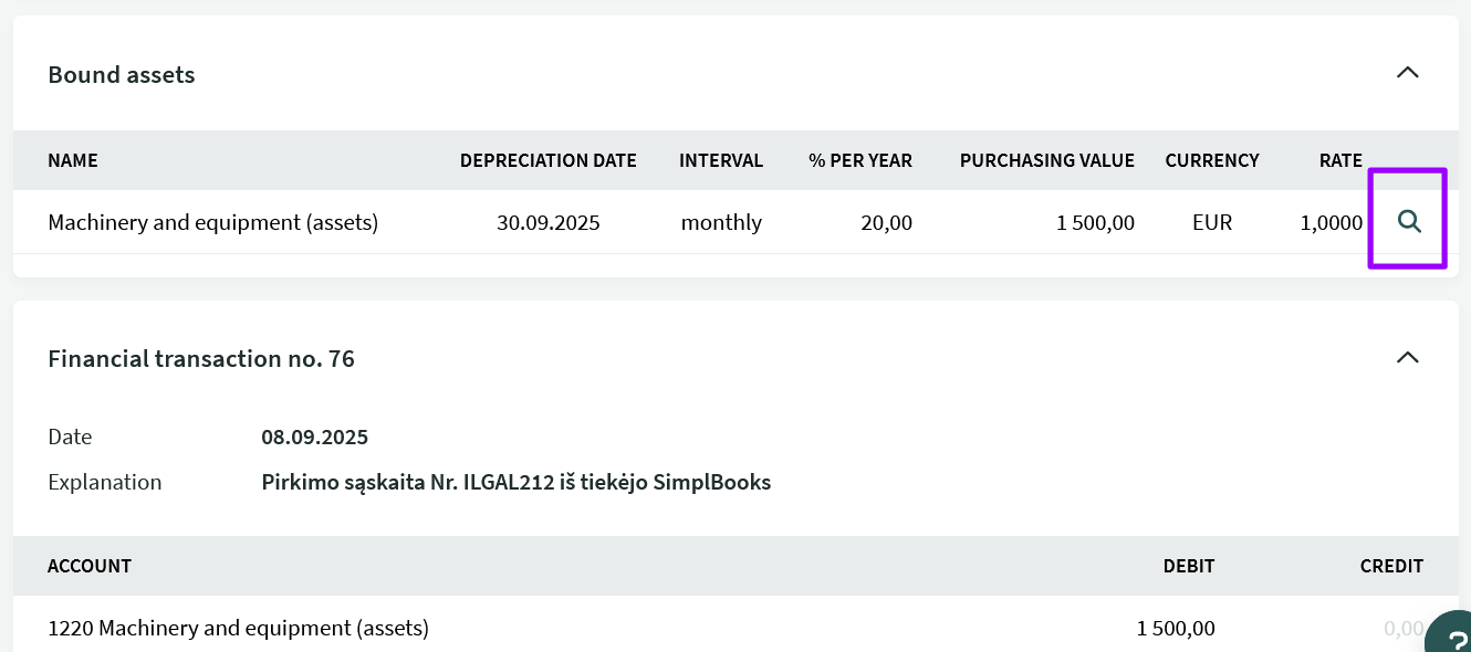 If you have configured automatic financial entries, the associated financial entry will also appear immediately (at the bottom of the page). Open created fixed assets by using the “Magnifying glass” icon, review the depreciation indicators.