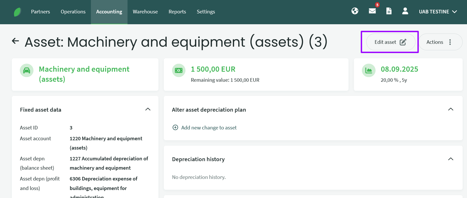 - Depreciation per year – annual depreciation calculation percentage, dependent upon which is the intended period of use of the asset (for example if the asset’s useful life is set at 5 years, then 20% should be entered here, i.e. 100% / 5 years = 20 %)