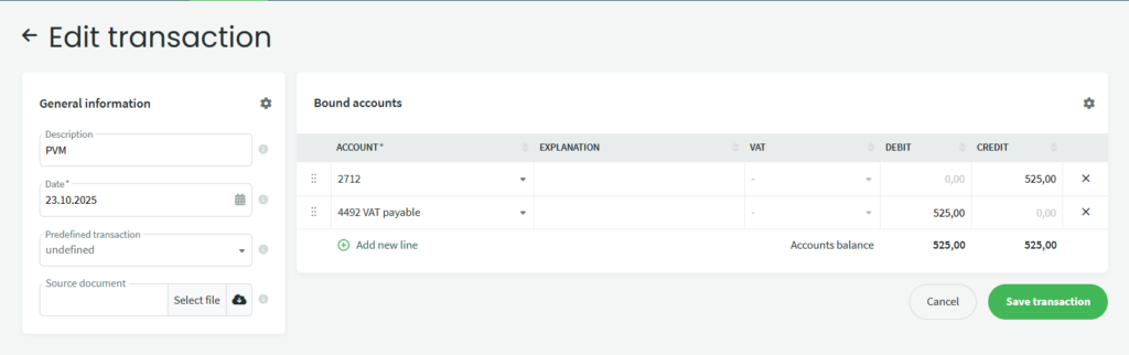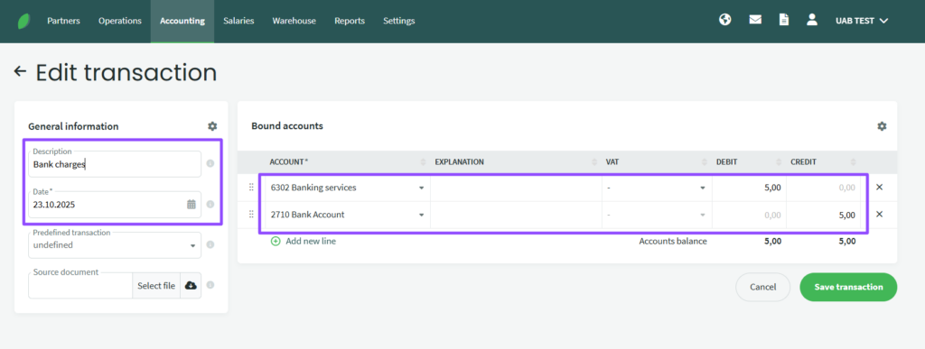 If you want to enter a payment that is not related to a purchase or sale, such as a bank commission fee or taxes, go to Accounting – Transactions, click +New transaction and enter the data (description, date, amount). The image below shows how to enter a bank commission entry, VAT payment entry).