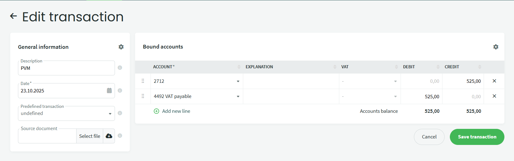 If you want to enter a payment that is not related to a purchase or sale, such as a bank commission fee or taxes, go to Accounting – Transactions, click +New transaction and enter the data (description, date, amount). The image below shows how to enter a bank commission entry, VAT payment entry).