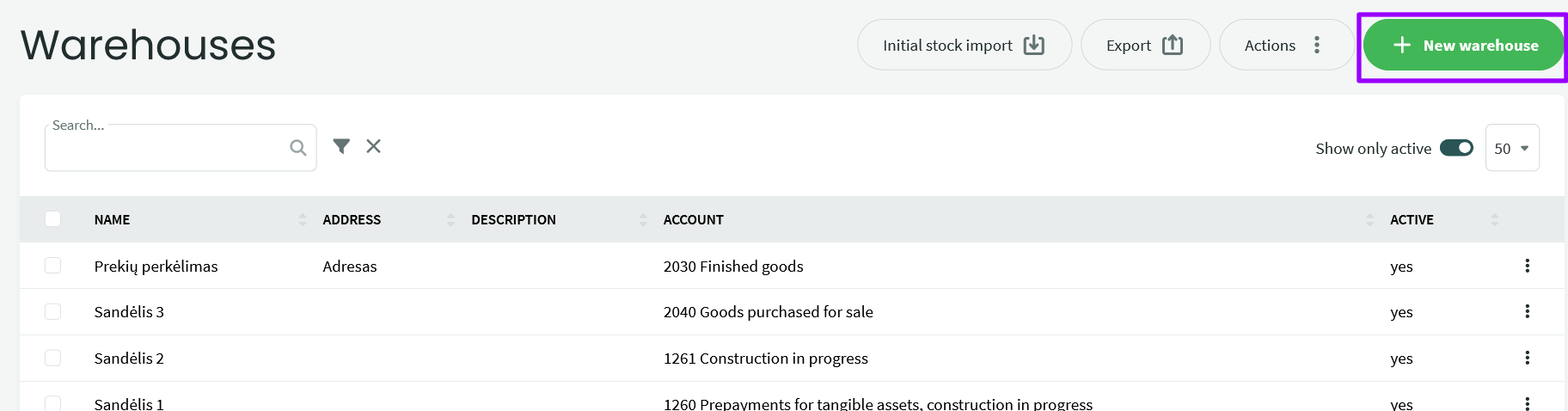Note: You can create the desired warehouses by going to the “Warehouse” menu > “Warehouses” and selecting “New Warehouse.” Enter the name, account, and address (as needed), and save the warehouse.