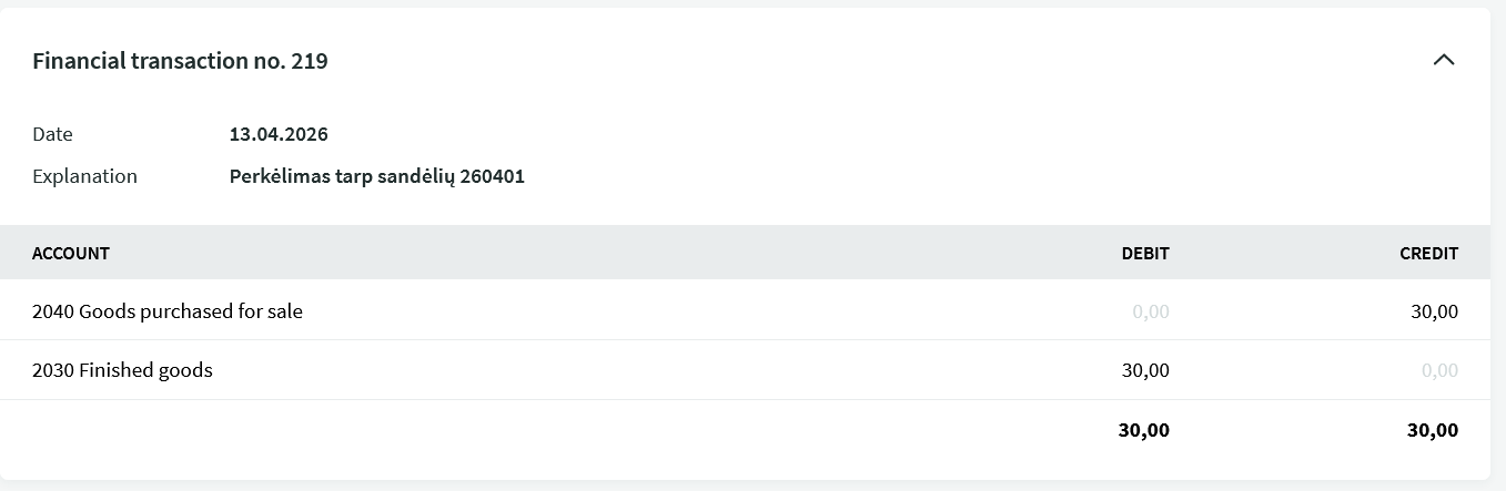 When a warehouse transfer is saved, a financial transaction is generated showing the changes in the warehouse accounts in monetary terms.
