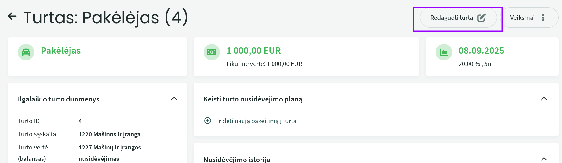 Jei pardavimo sąskaita jau įvesta, bet dar nesusieta su ilgalaikiu turtu, atidarykite ilgalaikio turto sąrašą iš pagrindinio meniu „Apskaita – Turtas“ ir spustelėkite parduoto ilgalaikio turto eilutę. Tada pasirinkite „Redaguoti turtą“ dešiniame viršutiniame kampe.
