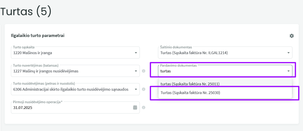 Redagavimo lange, tiesiai po langeliu “Šaltinio dokumentas”, dabar yra laukas „Pardavimo dokumentas“, kuriame galite įvesti konkrečią pardavimo sąskaitos eilutę, su kuria buvo parduotas ilgalaikis turtas. Norėdami tai padaryti, tiesiog pradėkite vesti turto pavadinimą (kuris nurodytas pardavimo dokumente) ir sistema automatiškai pasiūlys tinkamus variantus, iš kurių galėsite pasirinkti.