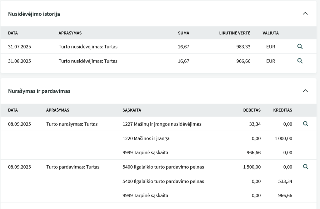 Išsaugojus pardavimo sąskaitą faktūrą, taip pat bus pakeisti susiję ilgalaikio turto įrašai, t. y. bus parengti ilgalaikio turto pardavimo ir nurašymo įrašai, kurie bus rodomi ilgalaikio turto kortelėje.