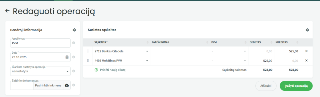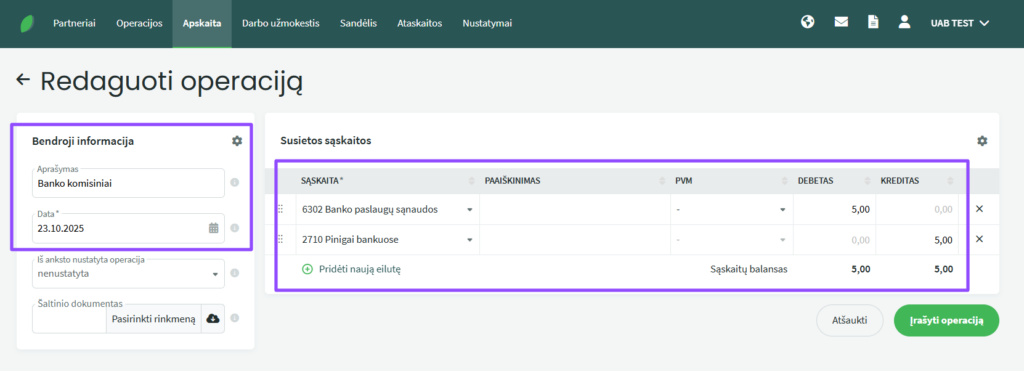 Jei norite įvesti mokėjimą, nesusijusį su pirkimu ar pardavimu, pvz., banko komisinį mokestį ar mokesčius, eikite į Apskaita – Operacijos, spustelėkite +Nauja operacija ir įveskite duomenis (Aprašymą, datą, sąsakitas). Žemiau paveikslėje pavaizuota kaip galima įvesti banko komisinių įrašą ar PVM mokėjimą.