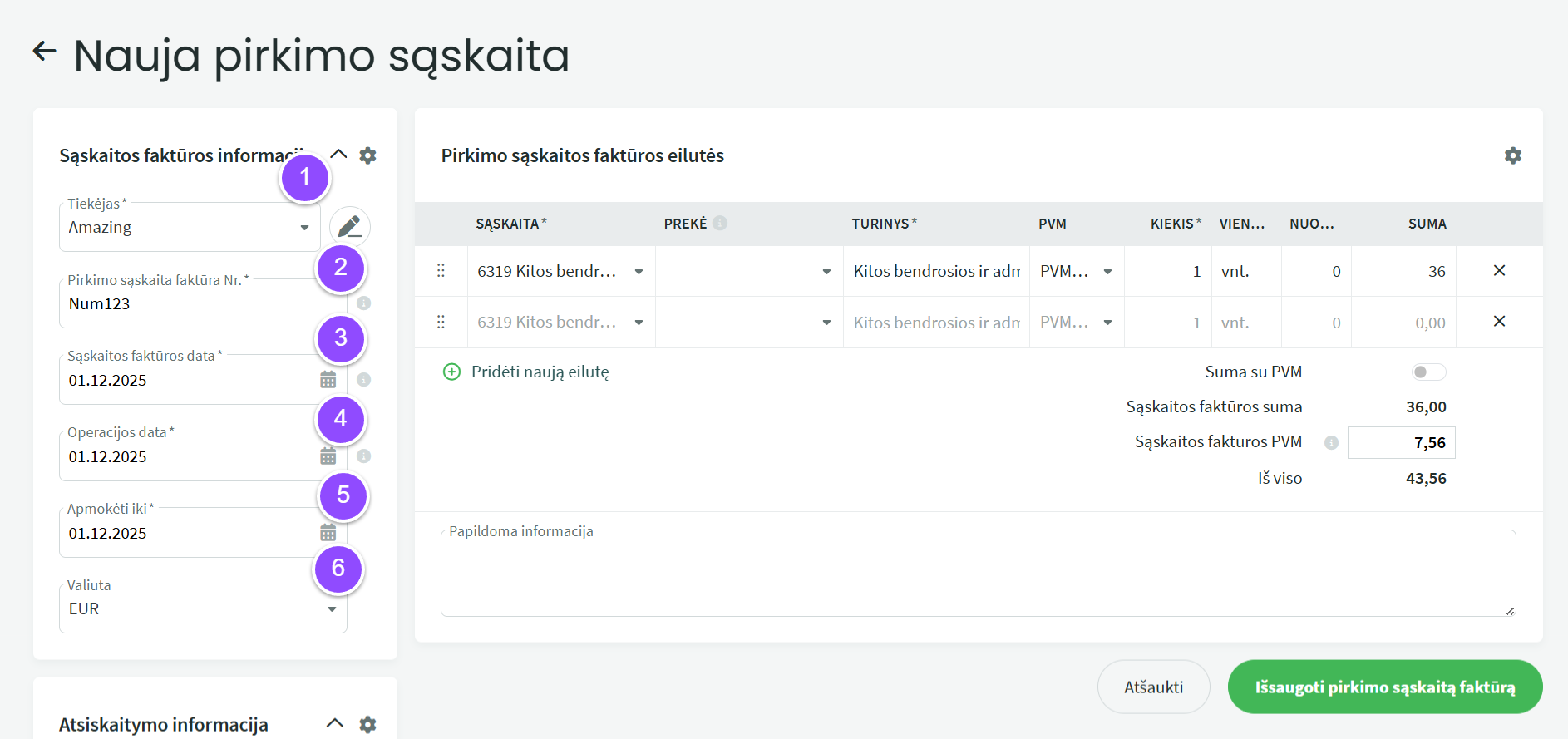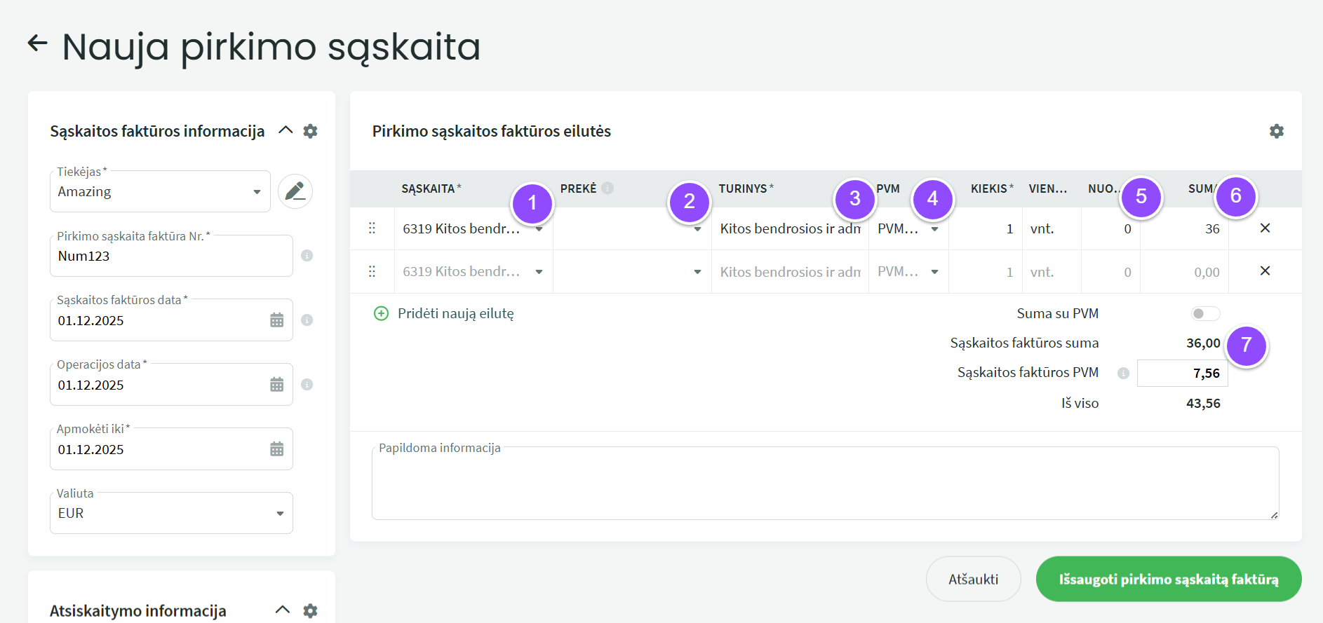 .1. Sąskaita – privalomas laukas. Numatytąją išlaidų sąskaitą galima nustatyti Nustatymai -> Automatinės operacijos -> Pirkimo sąskaitos faktūros. Su tiekėju susieta išlaidų sąskaita gali būti nustatyta tiekėjo kortelėje. Sąskaitas galima pridėti ir keisti rodinyje Apskaita -> Sąskaitos.